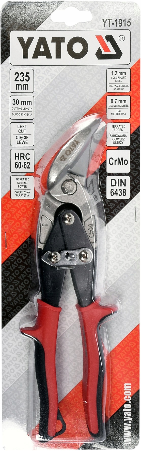 Profesjonalne, ręczne nożyce do cięcia blach. Szczęki odkuwane ze stali chromowo molibdenowej /CrMo/, utwardzane do ok. 60-62 HRC, hartowane indukcyjnie. Do cięcia blach stalowych o grubości do 1.2 mm i stali nierdzewnych do grubości 0,7 mm. Długość całkowita 235 mm. Profil - LEWE