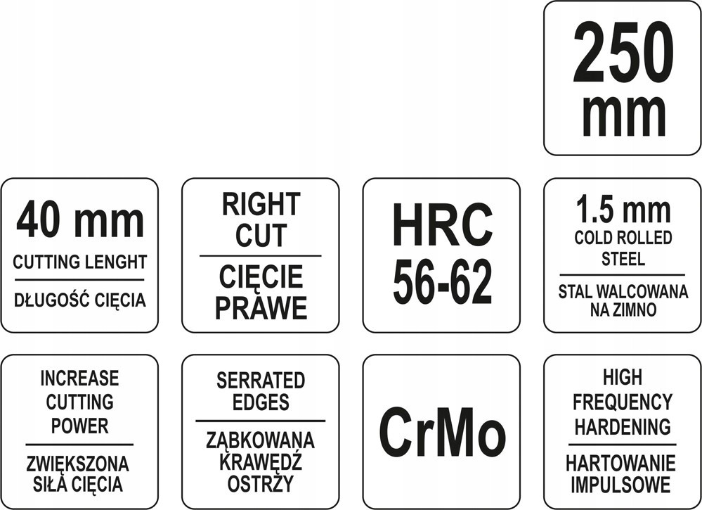 Nożyce do cięcia blachy odkuwane ze stali chromowo molibdenowej. Korpus utwardzany indukcyjnie do ok 46-52 HRC a szczęki tnące do 56-62 HRC. Pozwala to na swobodne przecinanie blach stalowych o grubości do 1,5 mm.rękojeści nożyc osłonięte nakładkami z tworzywa.Powierzchnia oxydowana, czarna. Długość całkowita 250 mm .
