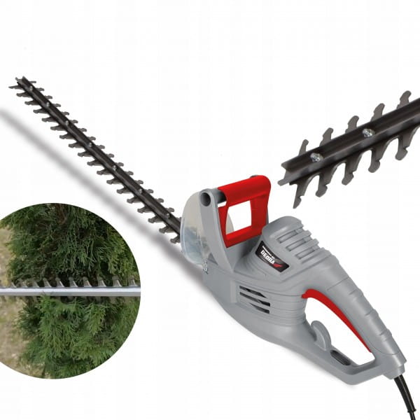 Elektryczne nożyce do żywopłotu to urządzenie przeznaczone do cięcia i pielęgnowania przydomowych krzewów o grubości gałęzi do 16 mm. Ostrza wycinane laserowo zapewniają ostre i precyzyjne cięcie. Listwa tnąca o długości 510 mm pozwala na cięcie wysokich lub trudno dostępnych krzewów. Niska waga urządzenia sprawia, że praca jest łatwa i komfortowa. Zabezpieczenie przed przypadkowym uruchomieniem oraz osłona dłoni zwiększają bezpieczeństwo podczas pracy. Otwór przelotowy pozwala na przytroczenie przewodu przedłużacza do urządzenia, aby zabezpieczyć przed plątaniem się przewodów i niechcianym odłączeniem zasilania.