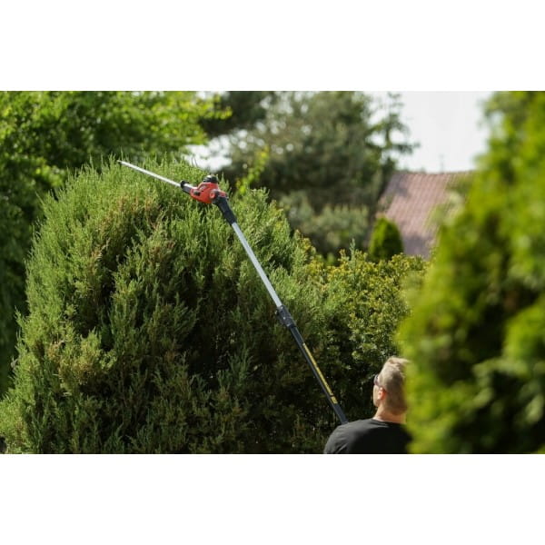 Urządzenie łączy w sobie dwie funkcje – w zależności od założonej głowicy jest okrzesywarką do obcinania konarów lub nożycami do żywopłotu.