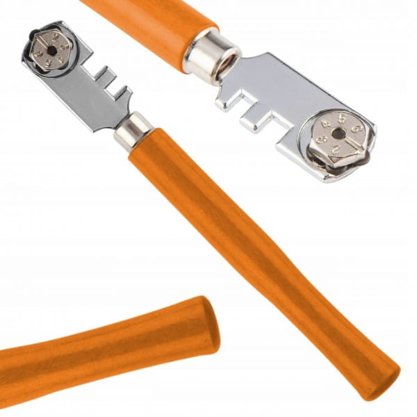 Z wygodnym, delikatnie profilowanym drewnianym uchwytem. Obrotowa głowica z 6 wymiennymi kółkami tnącymi z węglika spiekanego. Zastosowanie na 5000 m długości cięcia. Nóź sprawdzi się do cięcia zarówno szkła i glazury.