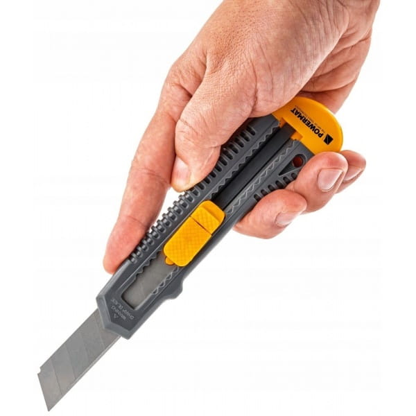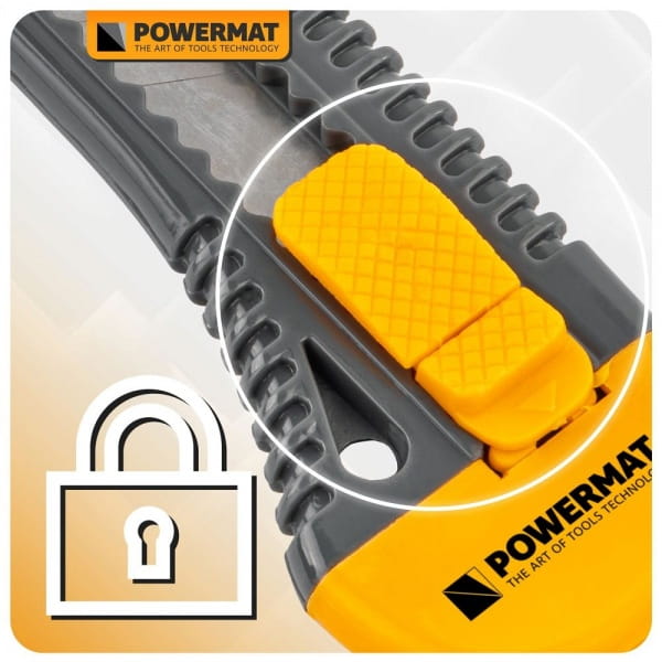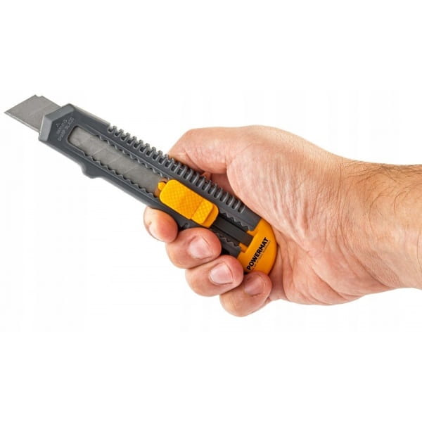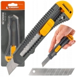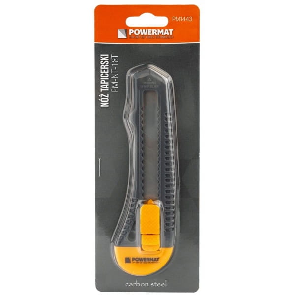 Nóż tapicerski Powermat został wyposażony w ostrze o wymiarach 0,5 × 18 × 100 mm, które zapewnia dokładne i czyste cięcie w szerokim zakresie materiałów.