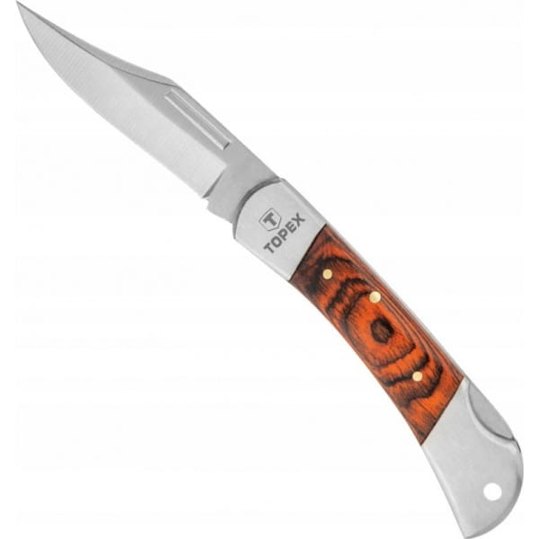 Nóż uniwersalny TOPEX (nr ref. 98Z017) o długości ostrza 75 mm. Korpus oraz ostrze wykonane z wysokiej jakości stali nierdzewnej, co gwarantuje długą żywotność narzędzia. Blokada ostrza zapewnia bezpieczeństwo podczas użytkowania. Dzięki drewnianym okładkom o ergonomicznym kształcie podniesiony jest komfort pracy. Możliwość złożenia ułatwia przechowywanie i transport. Marka TOPEX skierowana jest do majsterkowiczów.