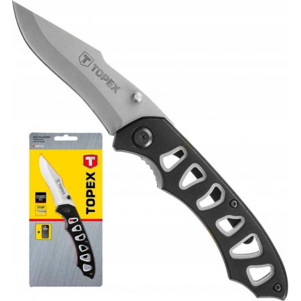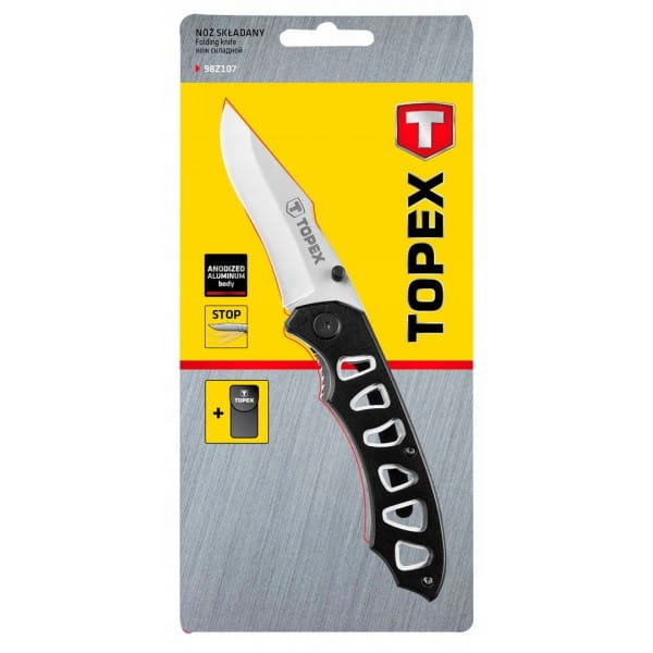 Nóż uniwersalny składany Topex (nr ref. 98Z107) ma wiele uniwersalnych zastosowań. Anodowane aluminium, z którego zbudowany jest korpus zapewnia wytrzymałość i odporność na korozje. Specjalny spust zabezpiecza ostrze przed nieoczekiwanym zamknięciem. Pokrowiec z wytrzymałego nylonu ułatwia przechowywanie i transport. TOPEX skierowana jest do majsterkowiczów.