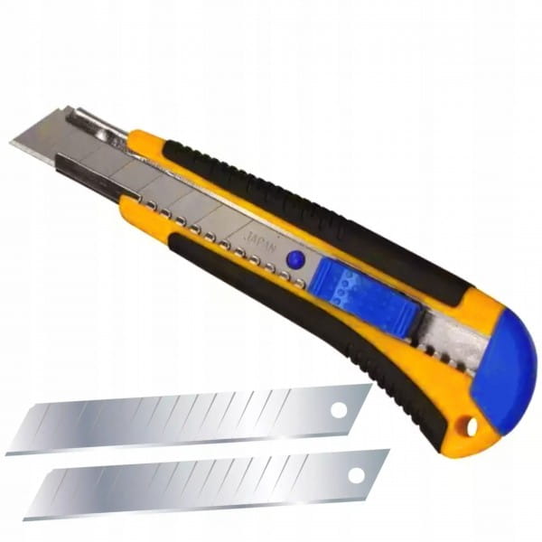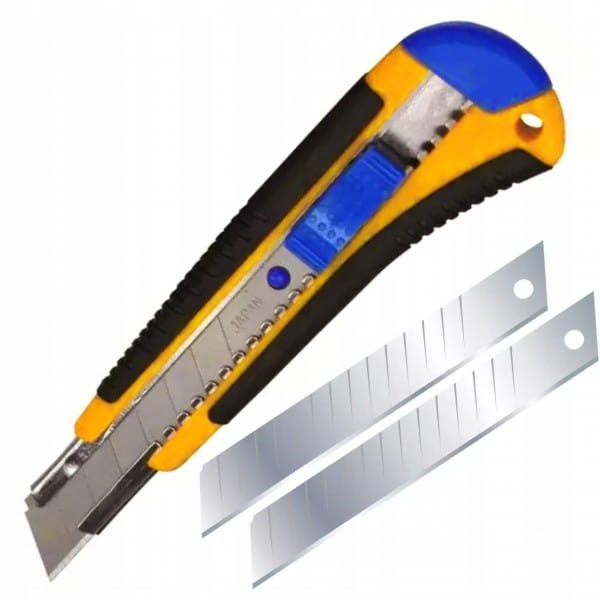 NÓŻ TAPICERSKI, TAPECIAK, NÓŻ ŁAMANY 18MM+ZAPAS. UCHWYT GUMOWANY, PROWADNICA METALOWA, BLOKADA SUWAKIEM