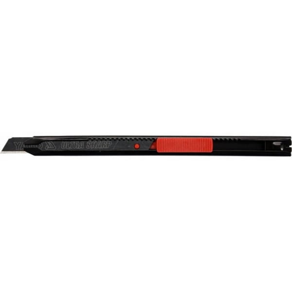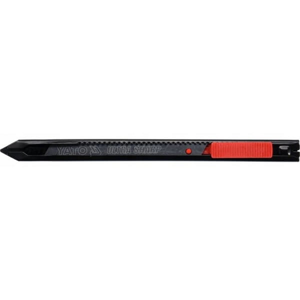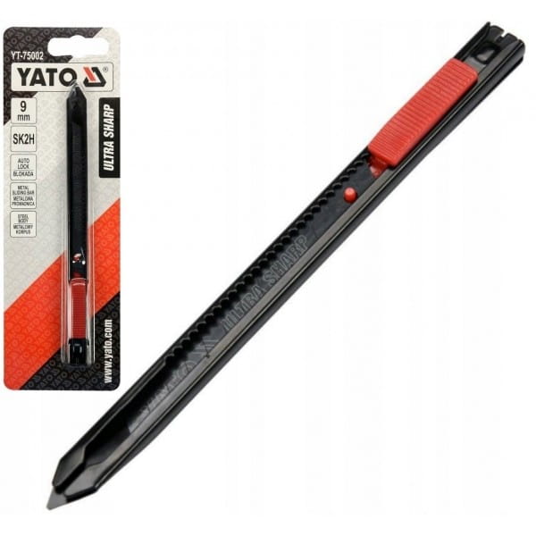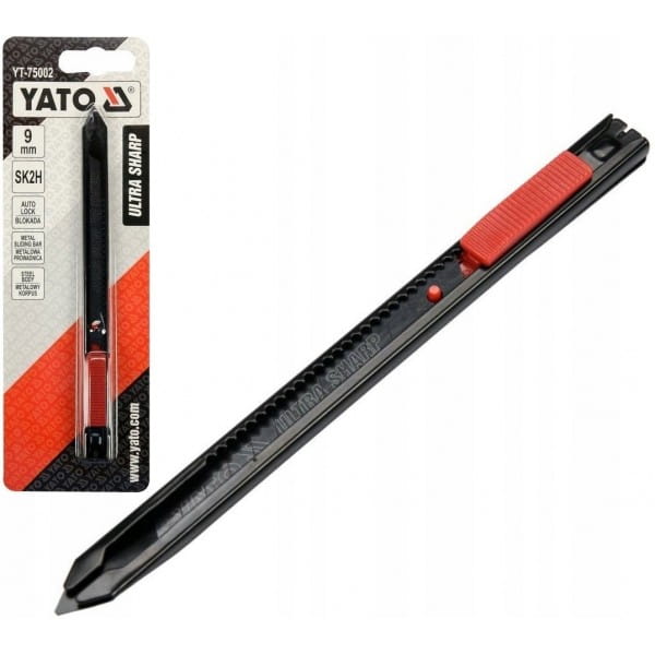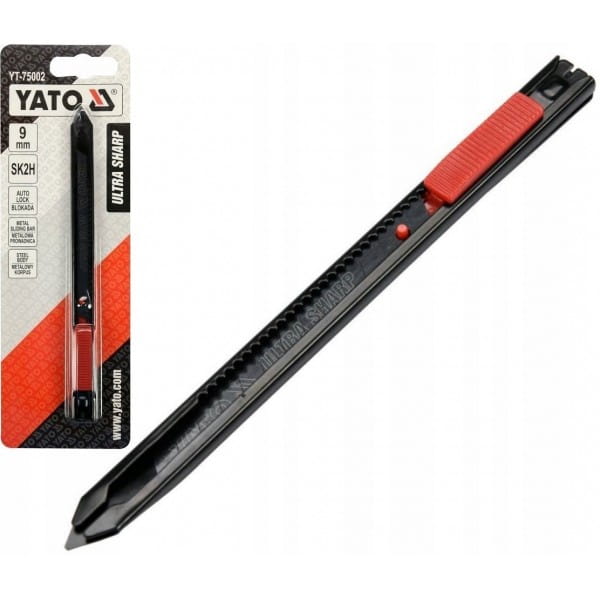 Nożyk z ostrzem łamanym 9mm marki YATO YT-75002. Ostrza wykonane ze stali ULTRA SHARP SK2H pokrytej specjalną czarną powłoką gwarantują wyjątkową ostrość, korpus wykonany z metalu. Rękojeść dodatkowo powleczona antypoślizgową powloką wykonaną z TPR. Zapewnia to pewny chwyt oraz wysoki komfort pracy. Metalowa prowadnica zapewnia płynną i bezawaryjną pracę. Ponadto wyposażona jest w system "auto lock", który zabezpiecza ostrze przed przypadkowym wysunięciem lub cofnięciem się podczas pracy, wytrzymując siłę do 20N. Dzięki systemowi "auto lock" nożyk doskonale sprawdza się podczas cięcia grubych materiałów czy w wąskich szczelinach, w których istnieje ryzyko zaklinowania się ostrza.
