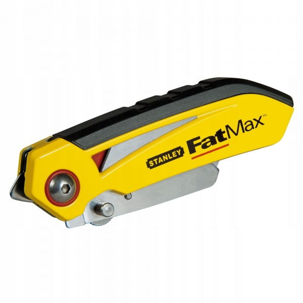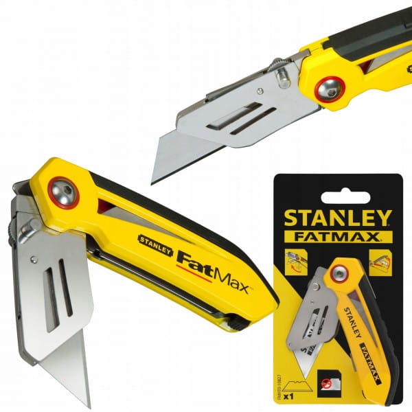 Profesjonalny nóż składany z ostrzem trapezowym Fatmax Stanley, z magazynkiem na zapasowe ostrza umieszczonym w rękojeści.
