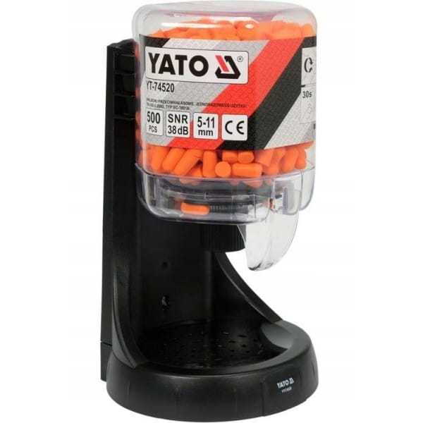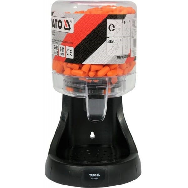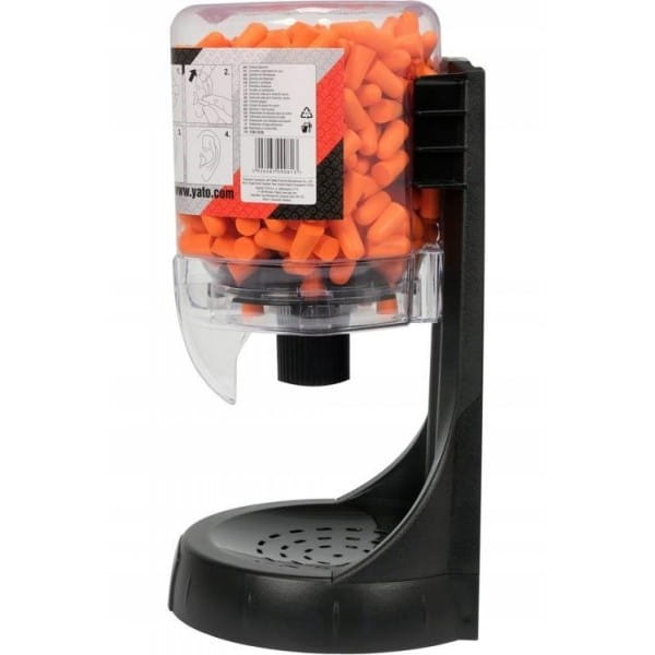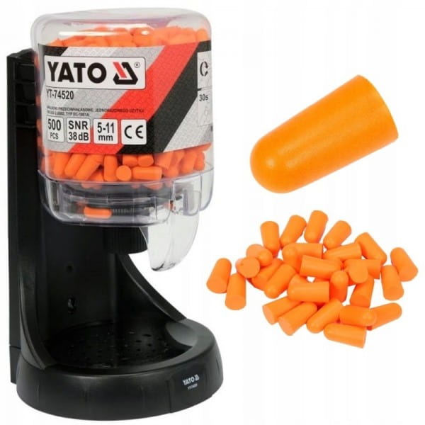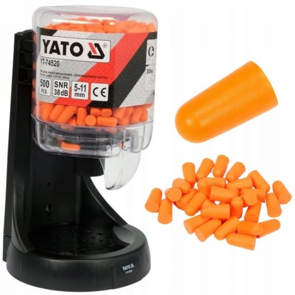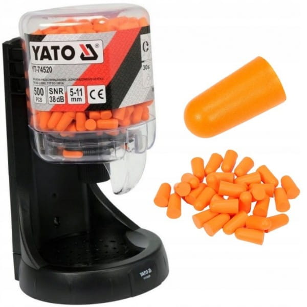 Dozownik YT-74520 z zatyczkami przeciwhałasowymi. Jednorazowe zatyczki do uszu wykonane z wolno rozprężającej się miękkiej pianki poliuretanowej. Po włożeniu do ucha i rozprężeniu są niemal niewyczuwalne. Charakteryzują się jedną z najwyższych w swojej klasie wartością tłumienia. Dyspenser można postawić na stole lub powiesić na ścianie. Przekręcenie pokrętła dyspensera dozuje wkładki na ręce użytkownika.