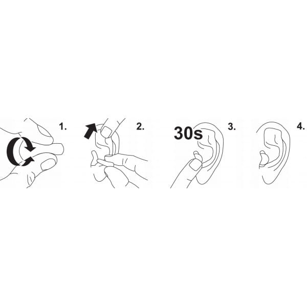 Rolując zatyczkę w dłoniach należy uformować ją w cylinder, a następnie wsunąć głęboko do ucha. Wsuniętą zatyczkę przytrzymać w kanale usznym przez około 30 sekund, aż do całkowitego rozprężenia. Przy pomocy palców lub w lustrze sprawdzić czy zatyczka została wsunięta do samego końca. Powinien być widoczny lub wyczuwalny tylko sam koniec zatyczki.