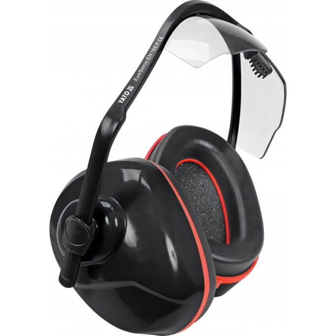 Nauszniki przeciwhałasowe zintegrowane z wymiennymi bezbarwnymi okularami ochronnymi YT-74636 chronią nie tylko słuch ale i oczy użytkownika. Zauszniki z regulacją na przegubach kulowych jednocześnie pełnią funkcje pałąka, co umożliwia pracę np. w kasku ochronnym bez dodatkowego ucisku głowy.