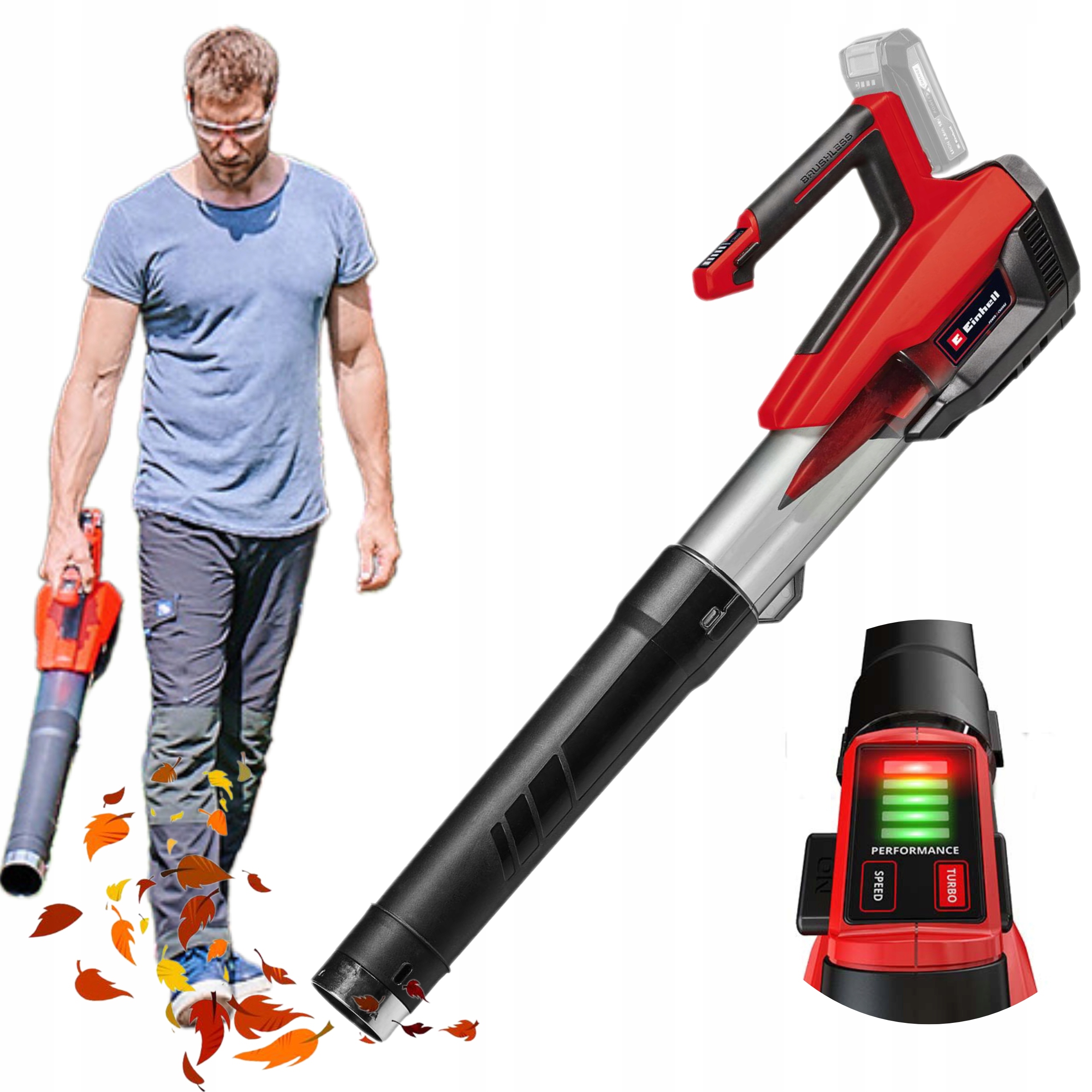 Napęd urządzenia stanowi silnik bezszczotkowy Einhell PurePOWER. Ten bezszczotkowy silnik zapewnia większą moc i dłuższy czas pracy niż konwencjonalne silniki ze szczotkami węglowymi. Technologia wentylatora osiowego zapewnia optymalną wydajność, a maksymalną moc nadmuchu aktywuje przełącznik turbo. Solidny metalowy pierścień na końcu rury chroni przed uderzeniami i gwarantuje długą żywotność rury dmuchawy. Elektroniczna regulacja prędkości wyposażona jest w praktyczny, wielostopniowy wyświetlacz LED. Zdejmowaną dmuchawę można zamontować bez użycia narzędzi. Bezprzewodowa dmuchawa do liści ma zintegrowany uchwyt ścienny, który ułatwia przechowywanie i oszczędza miejsce.