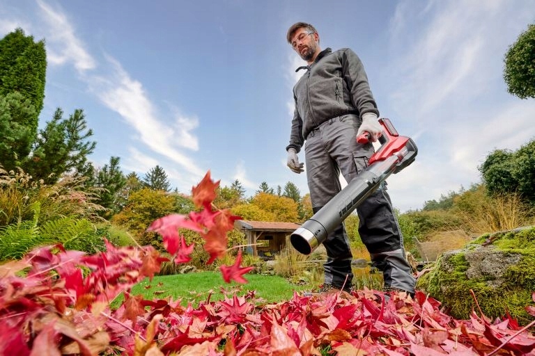 Akumulatorowa dmuchawa do liści Einhell Professional GP-LB 18/200 Li E-Solo to sprawdzony pomocnik w terenie, zwłaszcza podczas wiosennych i jesiennych porządków. Jako członek rodziny Power X-Change, wszystkie akumulatory z tej serii można łączyć z dmuchawą do liści. Do działania wymagany jest 1 akumulator 18 V. Aby uzyskać optymalną wydajność, zalecany jest akumulator PXC o pojemności 3,0 Ah i większy. Bezprzewodowa dmuchawa do liści jest znacznie cichsza niż jej odpowiednik z silnikiem benzynowym, a dzięki mniejszej masie jest łatwiejsza w obsłudze. Rękojeść balansująca z miękkim uchwytem zapewnia ergonomiczną pracę i wyjątkowo wygodną obsługę.