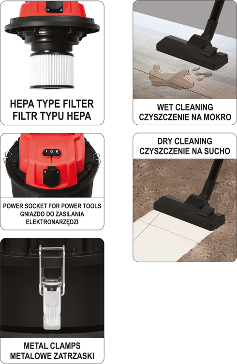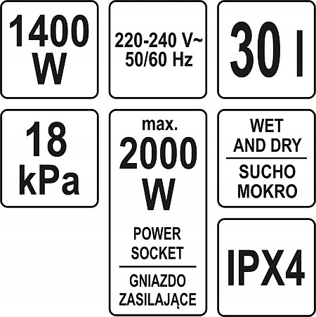 Odkurzacz warsztatowy YATO o mocy 1400W i mocy ssania 18 kPa. Posiada zbiornik o pojemności 30 L. Odkurzacz wyposażony jest w teleskopową, antystatyczną rurę. Ma także wbudowane gniazdo, pozwalające na zasilanie elektronarzędzi. Umożliwia pracę na mokro i sucho. Może również służyć jako dmuchawa.