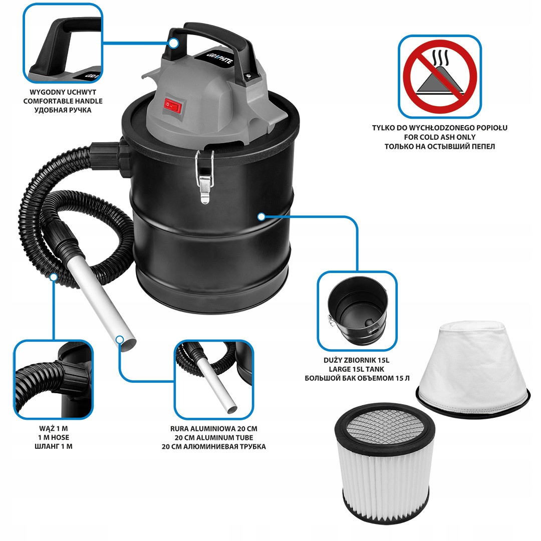 Odkurzacz do popiołu akumulatorowy Energy+ 18 V 58GE125 marki GRAPHITE o pojemności zbiornika15 litrów. Funkcjonuje w oparciu o system akumulatorowy Energy+. Rekomendowana bateria – 4 Ah (czas pracy na 2 Ah wynosi około 17 minut). Urządzenie wyposażone jest w zmywany oraz wielokrotnego użytku filtr typu HEPA oraz materiałowy filtr przeznaczony do pracy z pyłem. Zbiornik ze stali nierdzewnej polecany jest do użytku z wychłodzonym popiołem z kominka, grilla czy pieca. Odkurzacz dobrze sprawdza się również w tradycyjnej roli – do prac porządkowych w domu, warsztacie, garażu, piwnicy czy kotłowni. Do odsysania kamyków, piachu i wiórów. Posiada wąż ssący o średnicy 30 cm i długości 1 m. Długość aluminiowej rury wynosi 20 cm, a pojemny zbiornik wykonano z trwałej stali nierdzewnej. Odkurzacz funkcjonuje na podciśnieniu ?8 Kpa. Jego waga to 2,23 kg. Oferuje wygodę korzystania – także za sprawą komfortowego uchwytu do transportu. Marka GRAPHITE polecana jest na długie sezony użytkowania.