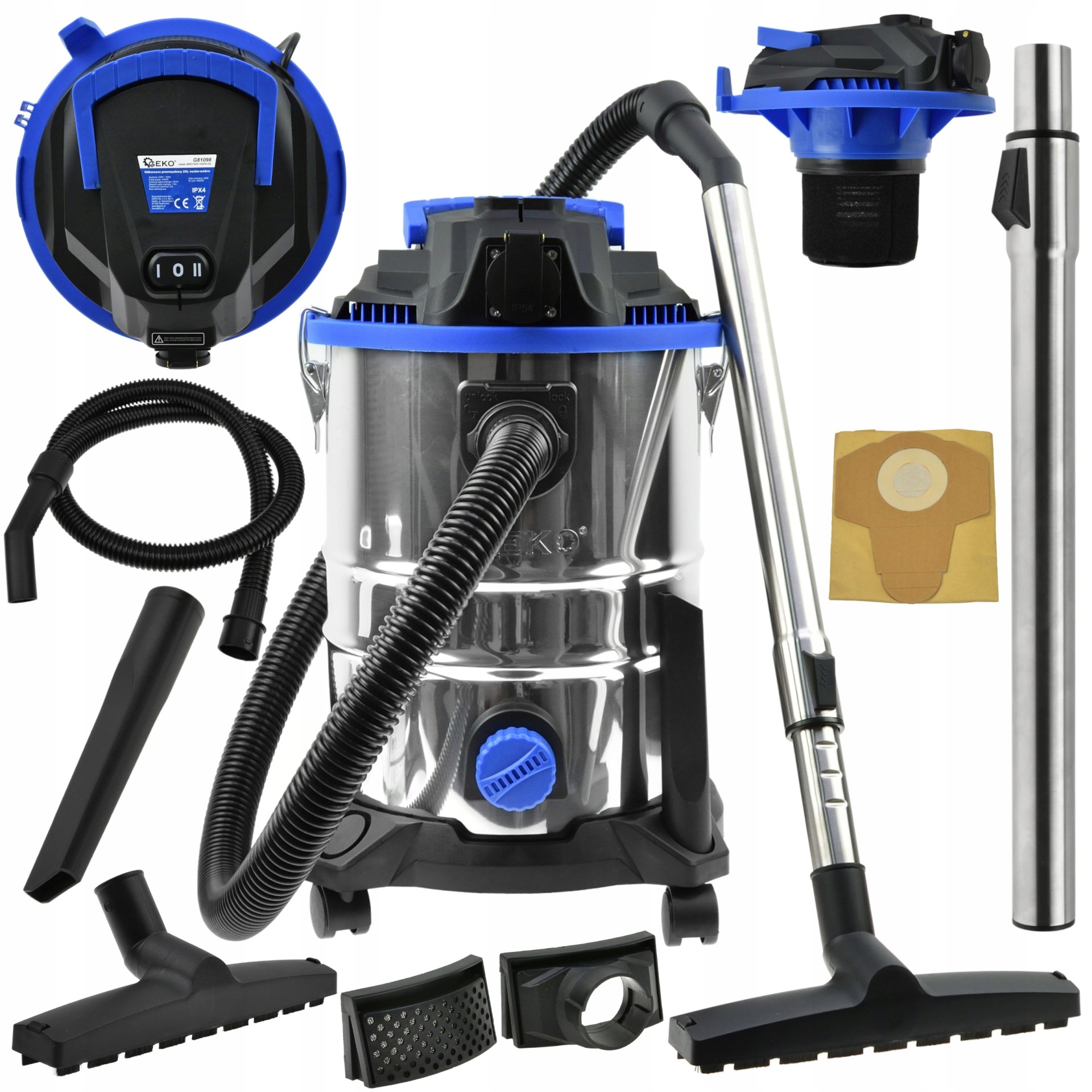Odkurzacz przemysłowy o mocy 1500W umożliwia szybkie i dokładne sprzątanie miejsca pracy. Przeznaczony do pracy na sucho i na mokro, co pozwala pozbyć się większości odpadów powstałych przy okazji wykonywania różnorodnych prac. Urządzenie wyposażone zostało w gniazdo umożliwiające podłączenie elektronarzędzia o mocy maksymalnej nie przekraczającej 2000W. Ponad to urządzenie posiada trójpozycyjny włącznik/wyłącznikpozwalający na prace w dwóch trybach. Zbiornik o pojemności 20l wykonany został ze stali nierdzewnej. Dodatkową funkcją odkurzacza jest dmuchawa pozwalająca np. wydmuchiwać nieczystości z trudnodostępnych miejsc. Odkurzacz wyposażony został w 4 skrętne kółka umożliwiające łatwe przemieszczanie się z urządzeniem.