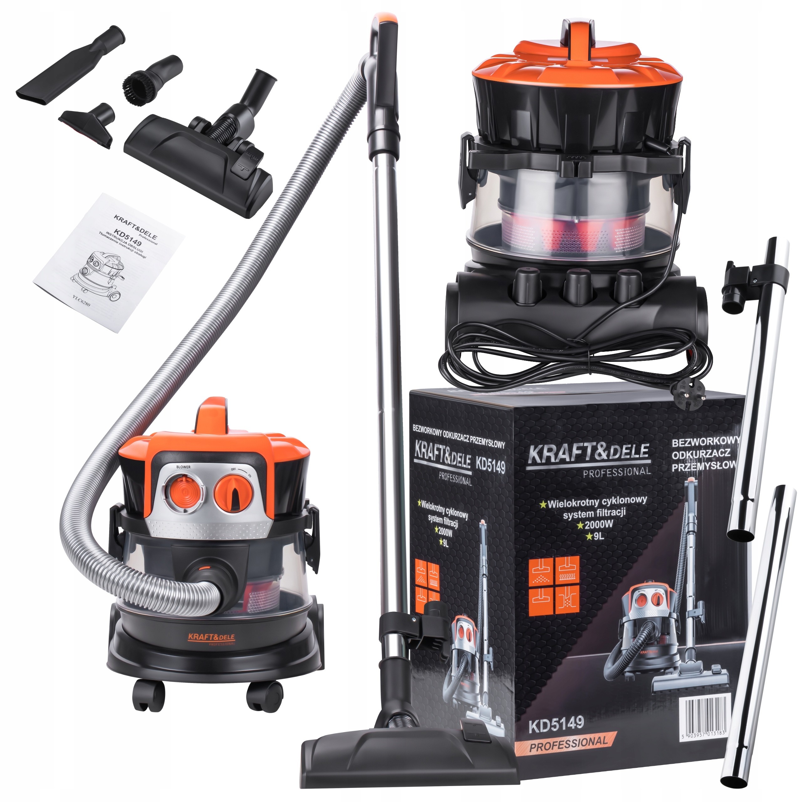Odkurzacz bezworkowy przemysłowy KD5149 polskiej marki Kraft&Dele. Odkurzacz spełnia unijne normy, przy tym jest bardzo wydajny. Wysokowydajny silnik elektryczny sprawia, że odkurzacz bez problemu radzi sobie z wszelkiego rodzaju zanieczyszczeniami, kółka umieszczone u podstawy ułatwiają przemieszczanie urządzenia podczas pracy. Odkurzacz posiada wielokrotny cyklonowy system filtracji. W zestawie znajdują się aż 4 końcówki czyszczące.