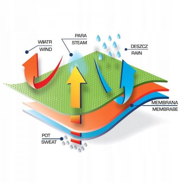 - Wstawki z 3- warstwowej tkaniny soft-shell z membraną TPU, wodoodpornej (8000mm), oddychającej (3000g/m2/24h), gwarantującej wysoki komfort użytkowania