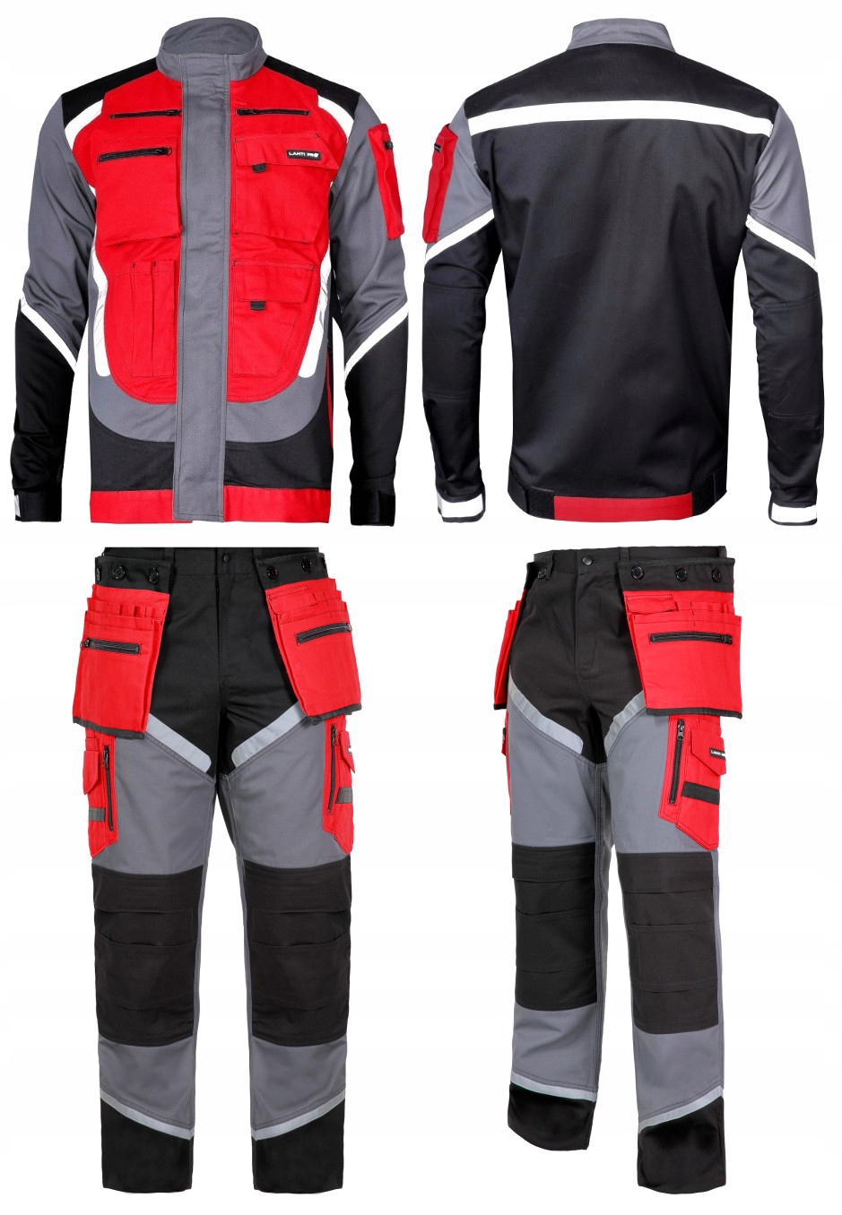 Spodnie z najnowszej kolekcji marki Lahti Pro L40505 wykonano z materiału o gramaturze 270g/m2 oraz stu procentowej bawełny w kolorze czarno-szaro-czerwonym z pasami odblaskowymi poprawiającymi widoczność pracownika podczas pracy. Spodnie posiadają 24 kieszenie w tym 4 zamykane na suwak. Praktyczne kieszenie monterskie z możliwością regulacji i odpięcia,  kieszeń na telefon komórkowy. Otwory wentylacyjne w kroku zwiększają cyrkulację powietrza. Potrójne szwy oraz dodatkowe wzmocnienia szwów w kroku. Regulacja szerokości w pasie za pomocą guzików i gumki. Dodatkowo spodnie posiadają oczko na klucze, dwie szlufki na młotek oraz dwa uchwyty na miarkę. Możliwość dokupienia ochraniaczy kolan model LPN001. Wszywka identyfikacyjna. Spodnie są w pierwszej kategorii środków ochrony indywidualnej. Posiadają certyfikat CE oraz normę EN ISO 13688.