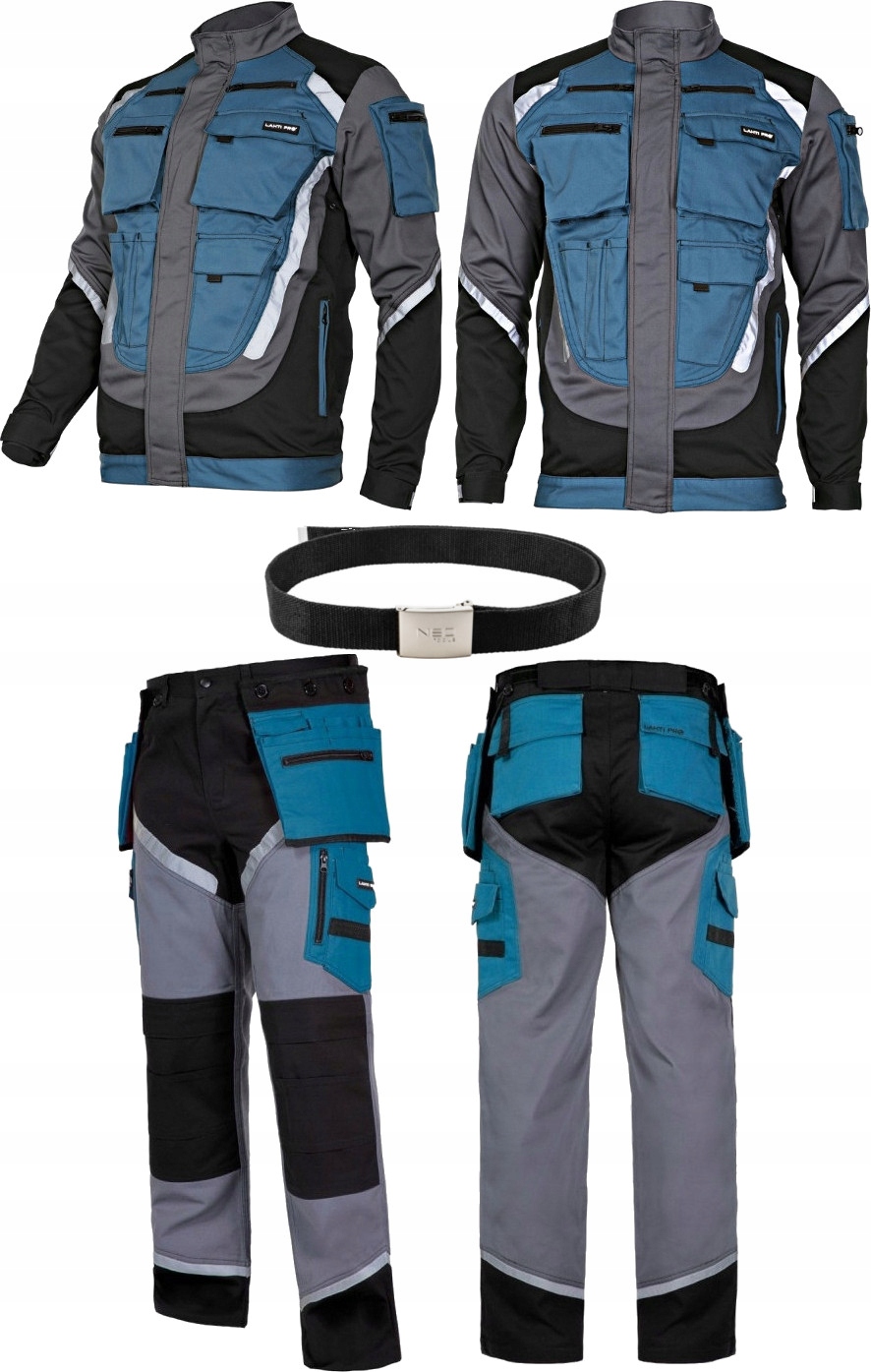 Spodnie z najnowszej kolekcji marki Lahti Pro. Spodnie robocze do pasa wykonano z materiału o gramaturze 270g/m2 (35% bawełny, 65% poliester) w kolorze czarno-szaro-turkusowym z pasami odblaskowymi poprawiającymi widoczność pracownika podczas pracy. Spodnie posiadają 24 kieszenie w tym 4 zamykane na suwak. Praktyczne kieszenie monterskie z możliwością regulacji i odpięcia, kieszeń na telefon komórkowy. Otwory wentylacyjne w kroku zwiększają cyrkulację powietrza. Potrójne szwy oraz dodatkowe wzmocnienia szwów w kroku. Regulacja szerokości w pasie za pomocą guzików i gumki. Specjalna konstrukcja klamry zapobiegająca jej zsuwaniu się. Dodatkowo spodnie posiadają oczko na klucze, dwie szlufki na młotek oraz dwa uchwyty na miarkę. Możliwość dokupienia ochraniaczy kolan model LPN001. Wszywka identyfikacyjna. Spodnie są w pierwszej kategorii środków ochrony indywidualnej. Posiadają certyfikat CE oraz normę EN ISO 13688.