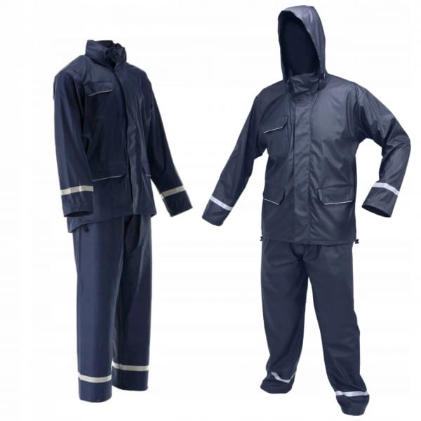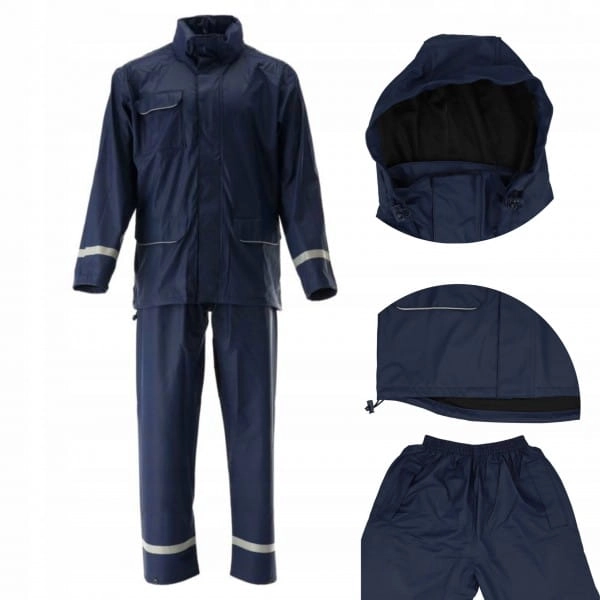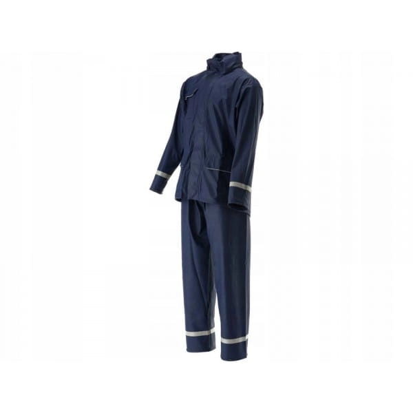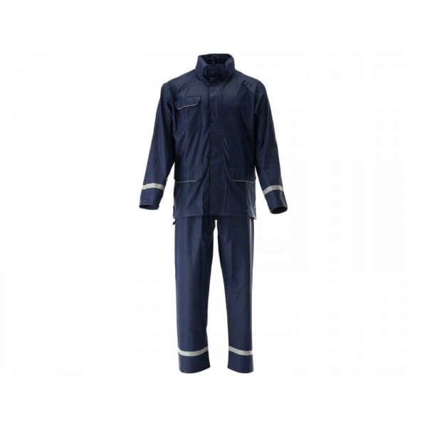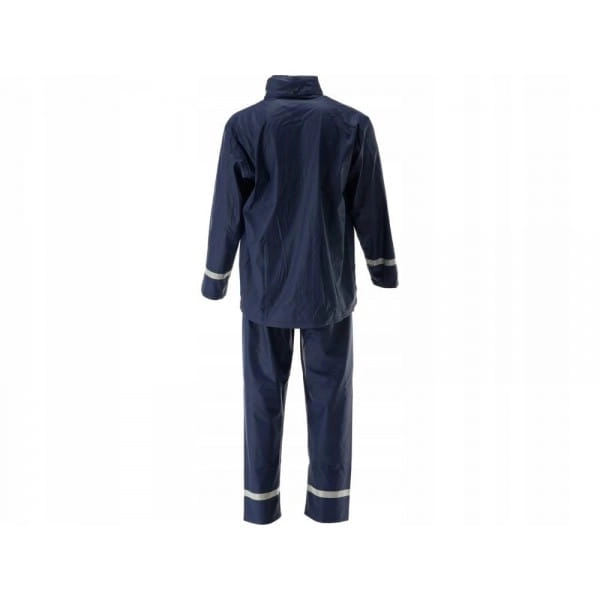 Komplet przeciwdeszczowy 2-częściowy marki Yato z wszytymi czterema liniami odblaskowymi na nogach i rękawach o szerokości 25 mm. Kurtka z trzema kieszeniami i regulowanym kapturem, spodnie z rozciągliwą gumką w pasie oraz ze szczelinami po bokach przez które możemy sięgnąć do kieszeni spodni.