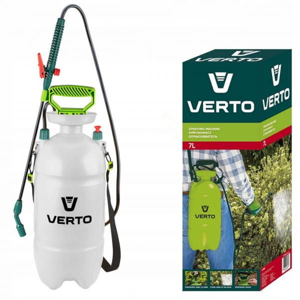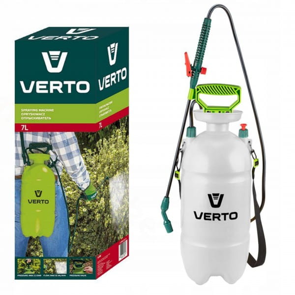 Opryskiwacz ciśnieniowy VERTO (nr ref. 15G506) o pojemności 7 litrów. Ciśnienie robocze 2.5 - 3 bary. Szeroka szyjka ułatwia napełnianie butli. Dodatkowy pasek umożliwiający zawieszenie zraszacza na ramieniu oraz blokada strumienia podnoszą komfort pracy. Zawór zapewnia bezpieczeństwo w trakcie użytkowania. Opryskiwacz można stosować w zakresie temperatur od 0 do + 45°C.