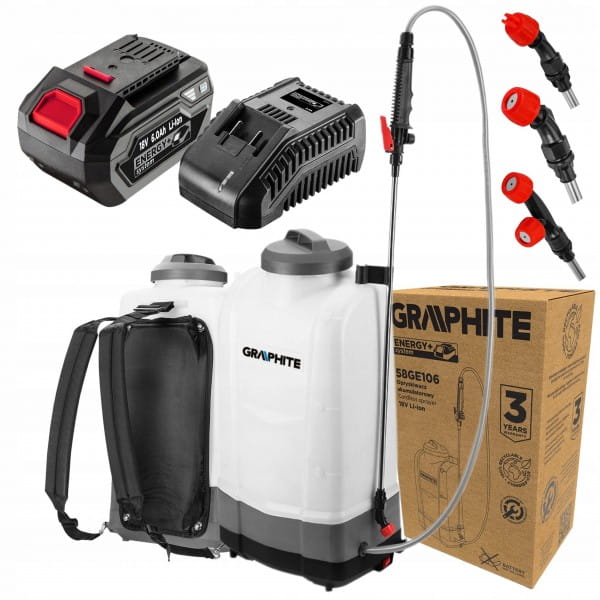 Opryskiwacz akumulatorowy Energy+ 18 V 58GE106 GRAPHITE to praktyczny, wyposażony w duży zbiornik 15 litrów produkt do opryskiwania trawników, rabatek, ogrodów czy upraw. Wielofunkcyjny opryskiwacz funkcjonuje w oparciu o nowoczesny system akumulatorowy Energy+. Został wyposażony w trzy dysze rozpylające o zróżnicowanym strumieniu oraz praktyczny pas na ramię. Obsługuje przepływ wody ?0,8 l/min (z podwójną dyszą natryskową). Jego maksymalne ciśnienie wynosi 3 bar. Posiada otwór dyszy o średnicy 1,6 mm.
