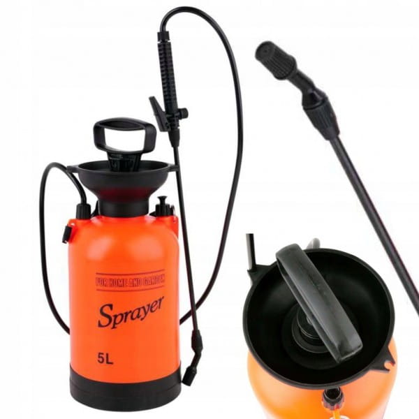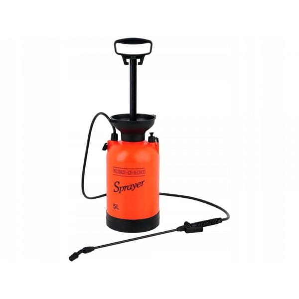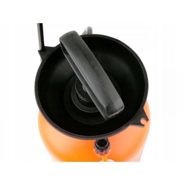 OPRYSKIWACZ CIŚNIENIOWY RĘCZNY 5L, SPRAYER Ręczny opryskiwacz ciśnieniowy ze zbiornikiem o pojemności 5L, - zasięg skutecznego oprysku do 3m, - zawór bezpieczeństwa zabezpieczający przed przekroczeniem dopuszczalnego ciśnienia maksymalnego, - duży skok tłoka 25 cm gwarantujący szybkie pompowanie, - lanca z uchwytem o długości całkowitej 56 cm z funkcją automatycznego oprysku i końcówka z regulacją szerokości i intensywności zraszania, - elastyczny przewód o długości 130 cm umożliwiający opryskiwanie ze zbiornika postawionego na ziemi, - stabilna prosta podstawa, - kielich na wlewie zabezpieczający przez ulewaniem w trakcie uzupełniania płynu, - dwa miejsca odkładcze na lancę, - pasek regulowany na ramię, - na zbiorniku skala pojemności w L i Oz. Zbiornik z tłokiem, lanca, wąż elastyczny