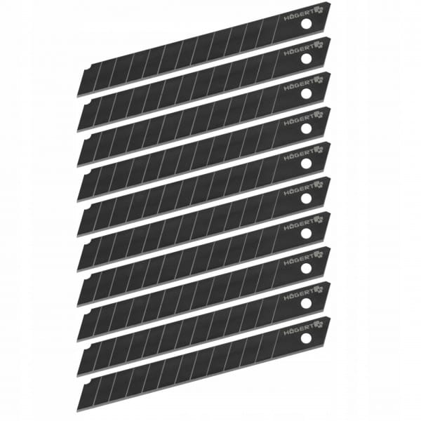 Komplet 10 ostrzy łamanych 9 mm wykonanych ze specjalnego stopu stali SK2H dedykowanej do nożyków tnących. Szczególnie przydatne do prac wykończeniowych, cięcia kartonów, tapet, wykładzin, tkanin plandekowych, folii drukarskich oraz folii PVC itp.