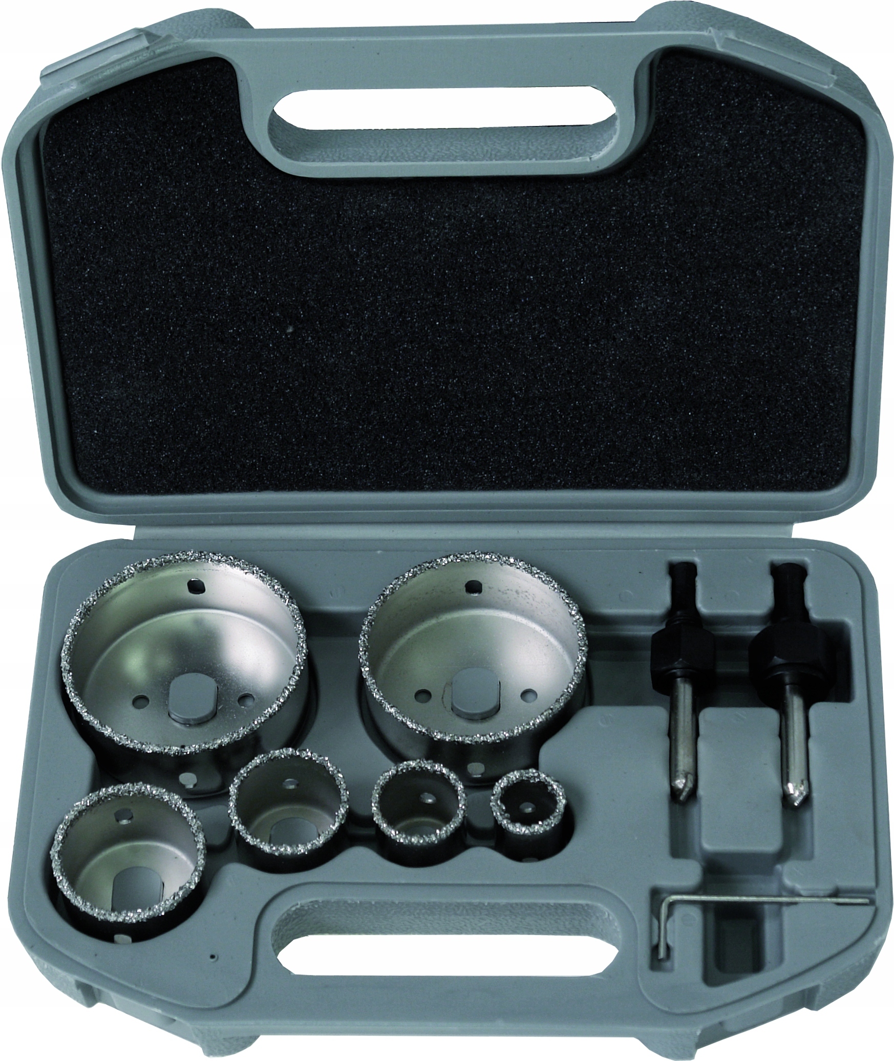 Zestaw 6 wierteł koronkowych precyzyjnych z nasypem węglika wolframu. Wiertło pilotujące posiada uchwyt szczeciokątny (HEX). Koronki przeznaczone są do wiercenia otworów w płytach kartonowo-gipsowych, materiałach ceramicznych, glazurze. Głębokość każdej z koron to 28mm, średnice od 22-73mm
