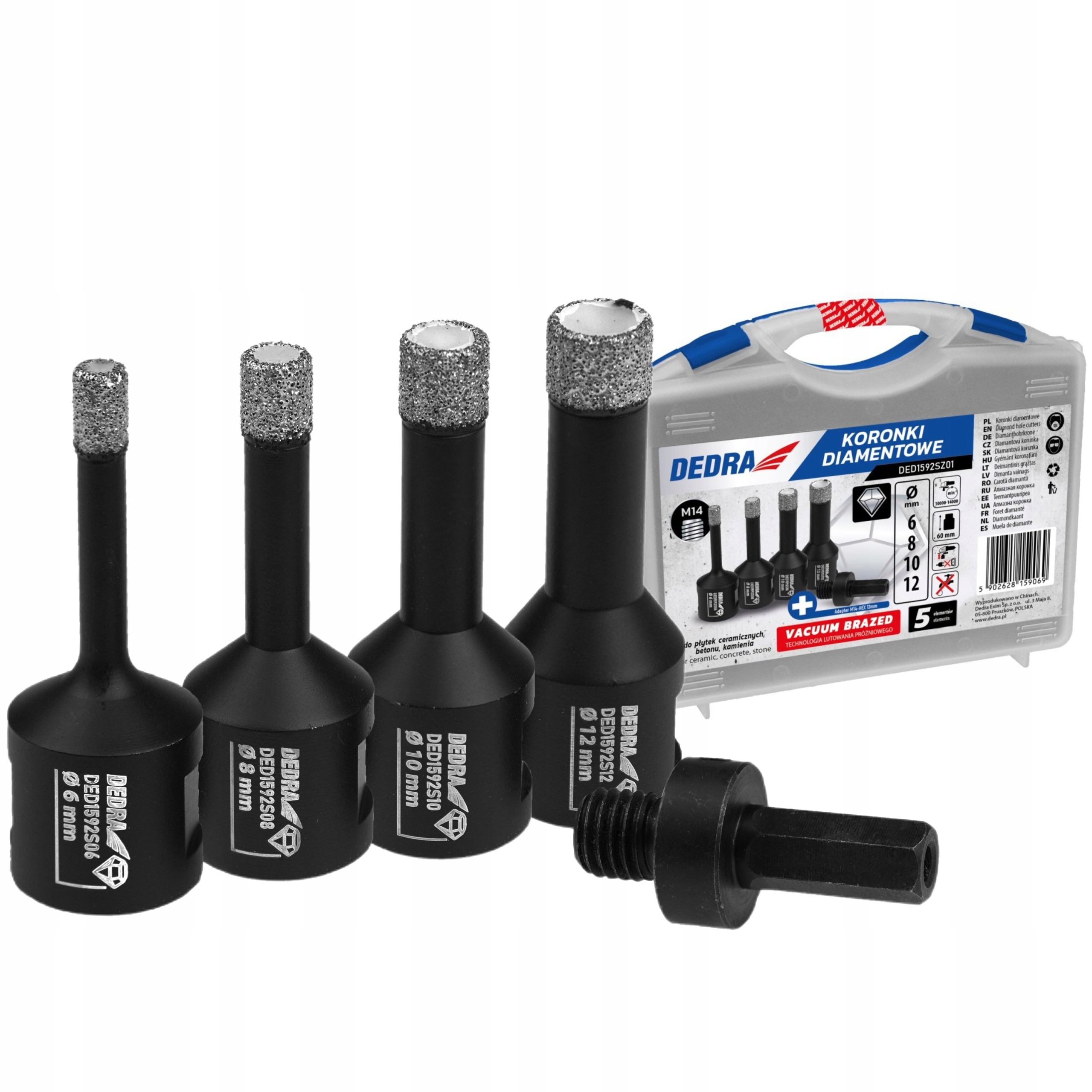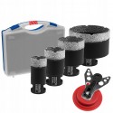 Zestaw 4 koronek diamentowych Vacuum Brazed przeznaczonych do wykonywania otworów w płytkach ceramicznych, gresie,betonie, cegle, szkle, asfalcie, laminatach, PCV, stali, metalach nieżelaznych, drewnie itp. Technologia Vacuum Brazed gwarantuje dużą czystość, wytrzymałość połączenia ziaren diamentu z osnową i korpusem. Brak lutowanych czy spawanych laserowo elementów (segmentów diamentowych), które mogą zostać oderwane od korpusu podczas pracy, zapewniają bezpieczeństwo pracy narzędziem. Zastosowanie gwintu M14 umożliwia montaż koronki do każdej szlifierki kątowej. Koronki VB mogą być przeznaczone do pracy na sucho i mokro. W zestawie adapter M14 do HEX, dzięki czemu można wykorzystać koronki diamentowe z wiertarkami.
