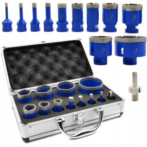 Zestaw otwornic diamentowych w rozmiarach od 6 do 68 mm. Wyposażona w gwint montażowy M14 do mocowania w szlifierkach kątowych. Idealne do wykonywania otworów w materiałach takich jak: gres, płytki ceramiczne, klinkier, glazura oraz kamień naturalny.
