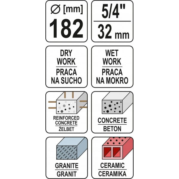 Wiertło koronowe YATO do wiertnicy przeznaczone do pracy bez udaru – na sucho i mokro – z wiertnicą (np. YT-81980). Umożliwia szybkie i precyzyjne wiercenie otworów, także bez statywu, w żelbecie, betonie, silikatach, np. pod puszki elektryczne, przewiercanie stropów pod rury i kable, montaż tras kablowych lub kanałów wentylacyjnych.
