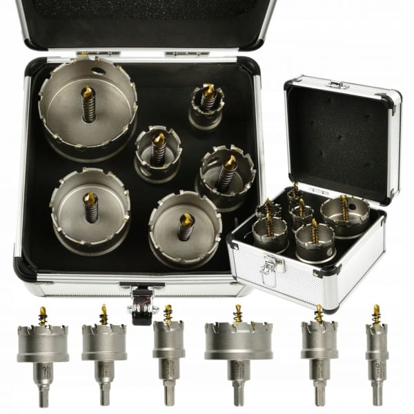 Zestaw 6 szt. otwornic TCT do metalu w rozmiarach 22-65mm. Ostrza wykonane z węglików spiekanych, które charakteryzują się znacznie większą twardością oraz odpornością na wysokie temperatury w porównaniu do stali szybkotnącej HSS. Przeznaczone do wykonywania większej średnicy otworów w stali, żeliwie, metalach kolorowych, drewnie, tworzywach sztucznych itp. Dla zwiększenia precyzji cięcia zastosowano wiertło prowadzące ze stali HSS. Sprężyna zamocowana na wiertle prowadzącym, pozwala w łatwy sposób usunąć urobek.