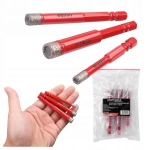 Zestaw trzech wysokiej jakości wierteł diamentowych KD12645 marki Kraft&Dele przeznaczony jest do precyzyjnego wiercenia w twardych materiałach takich jak gres, ceramika, lastryko czy kamień syntetyczny. Diamentowy nasyp o wysokości około 10 mm wykonany metodą lutowania próżniowego gwarantuje wyjątkową trwałość i wytrzymałość wierteł.