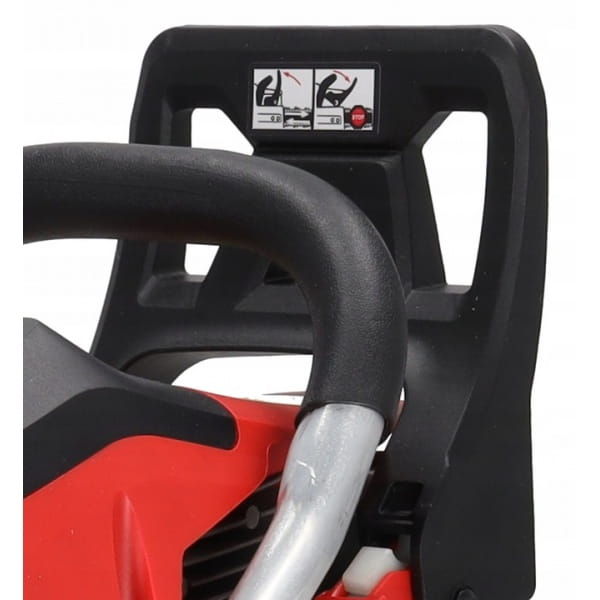 Piła dodatkowo posiada mechanizm natychmiastowego zatrzymania łańcucha, który w przypadku podbicia urządzenia podczas cięcia automatycznie unieruchamia zarówno łańcuch, jak i pilarkę, co znacząco podnosi poziom bezpieczeństwa użytkownika.