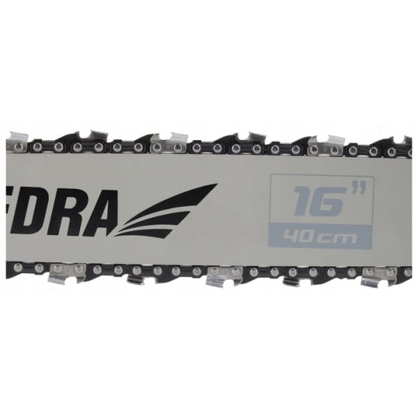 Długość prowadnicy w tym modelu to 40 cm. Pilarka została wyposażona w system pozwalający na szybką i łatwą korektę stopnia napięcia łańcucha bez użycia narzędzi. Prędkość łańcucha wynosząca 13m/sek zapewni użytkownikowi szybkie i efektywne cięcie. Urządzenie posiada bezpieczny włącznik, zabezpieczający przed przypadkowym uruchomieniem.