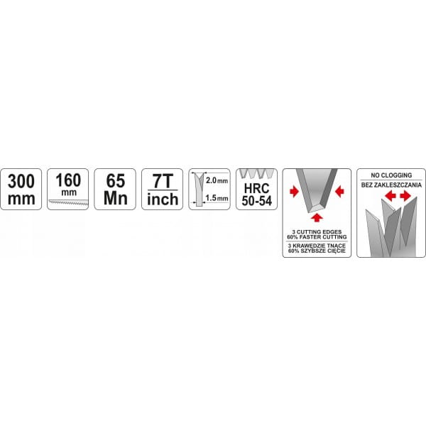 Krótki brzeszczot i szpiczasty, nożowy kształt pozwalają na wykorzystanie piły przy realizacjach w technologii suchej zabudowy. Brzeszczot wykonany ze stali manganowej o symbolu Mn65, odporny na ścieranie i odkształcenia. Zęby piły o specjalnym trójstronnym profilu przystosowane są do agresywnego cięcia w obu kierunkach. Zęby utwardzane do 50-54 HRC. Podziałka 7 TPI .