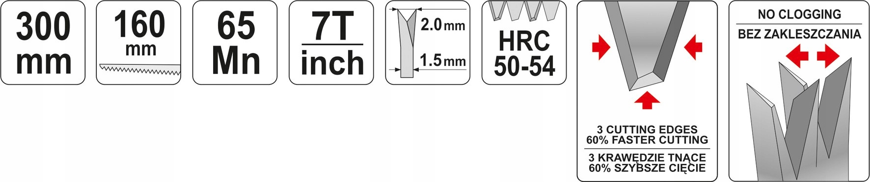 Krótki brzeszczot i szpiczasty, nożowy kształt pozwalają na wykorzystanie piły przy realizacjach w technologii suchej zabudowy. Brzeszczot wykonany ze stali manganowej o symbolu Mn65, odporny na ścieranie i odkształcenia. Zęby piły o specjalnym trójstronnym profilu przystosowane są do agresywnego cięcia w obu kierunkach. Zęby utwardzane do 50-54 HRC. Podziałka 7 TPI .