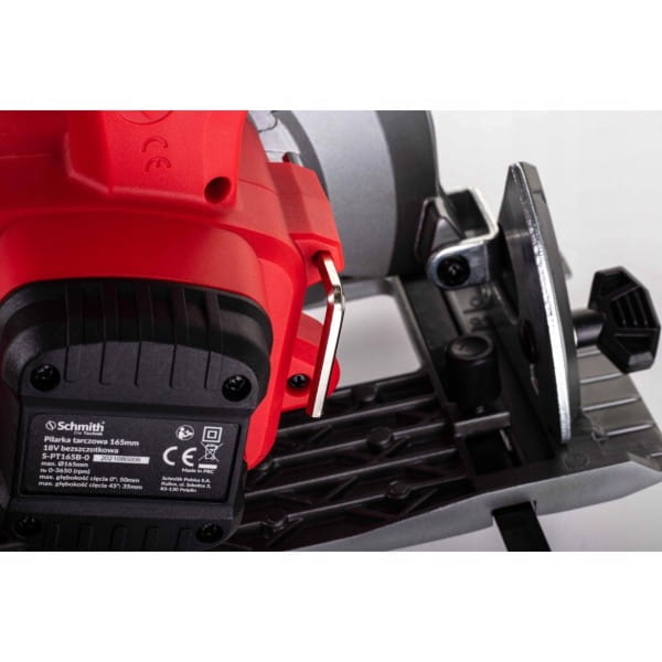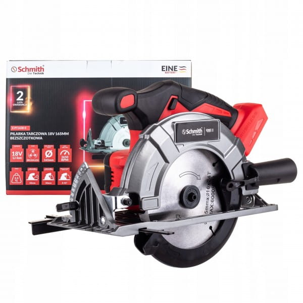 Pilarka tarczowa marki Schmith 165MM 18V to bardzo wydajne elektronarzędzie z nowej serii EINE BATTERY+ Urządzenie z linii EINE BATTERY+ to linia narzędzi akumulatorowych Schmith, które zasilane są tym samym akumulatorem.