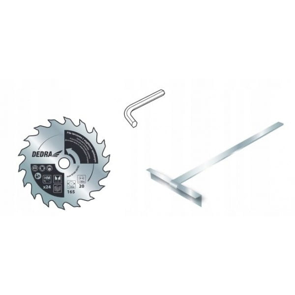Poprzez zastosowanie tarczy o rozmiarze 165mm, uzyskujemy możliwość cięcia drewna o grubości 55mm oraz 40 mm przy cięciu pod kątem 45 stopni. Ergonomie oraz komfort pracy poprawiają podgumowane oraz dobrze wyprofilowane uchwyty, dzięki którym narzędzie dobrze leży w dłoni. Dodatkowa prowadnica równoległa znajdująca się w komplecie, zapewni precyzyjne i powtarzalne cięcie. Pilarkę wyposażono w zabezpieczenie przed przypadkowym uruchomieniem. Obudowa wykonana została z nylonu z domieszką włókna szklanego, dzięki temu zwiększona została odporność na uszkodzenia mechaniczne i promieniowanie UV.