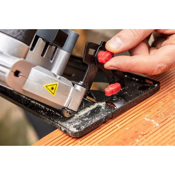 Główna osłona tarczy wykonana jest ze stopu aluminium, co zapewnia wytrzymałość i trwałość. Pilarka tarczowa jest również wyposażona w zintegrowany wskaźnik laserowy, który ułatwia precyzyjne wyznaczanie kierunku cięcia. W zestawie znajduje się także prowadnica równoległa, która umożliwia precyzyjne prowadzenie pilarki wzdłuż krawędzi materiału.