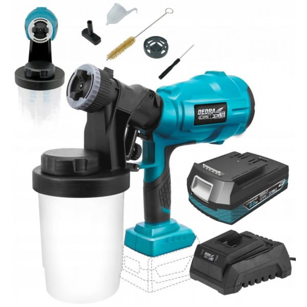 Akumulatorowy agregat do malowania natryskowego DED7057 jest przeznaczony do rozpylania lakierów i substancji gruntujących i na bazie wody, emalii akrylowych, emalii olejno- ftalowych. Regulacja kształtu strumienia natrysku odbywa się poprzez zmianę pozycji nakładki z dyszami w pistolecie lakierniczym.Szerokość strumienia także można regulować poprzez przełącznik w pistolecie lakierniczym. Zbiornik na farbę został tak zaprojektowany aby było możliwe dolewanie farby bez demontowania zbiornika. Agregat jest prosty w obsłudze i czyszczeniu.