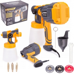 Pistolet do malowania marki POWERMAT został wyposażony w wytrzymały i wydajny silnik o mocy 550 W, jest niezastąpionym narzędziem do użytku domowego.