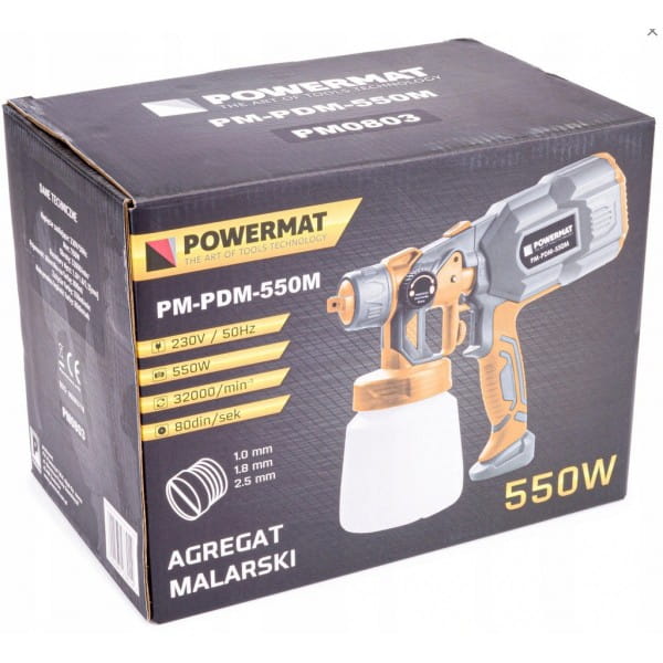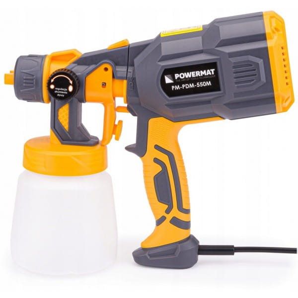 Pistolet do malowania marki POWERMAT został wyposażony w wytrzymały i wydajny silnik o mocy 550 W, jest niezastąpionym narzędziem do użytku domowego.