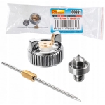 W zestawie znajduje się dysza zewnętrzna powietrza wykonana z aluminium, dysza wewnętrzna farby miedziana oraz iglica.