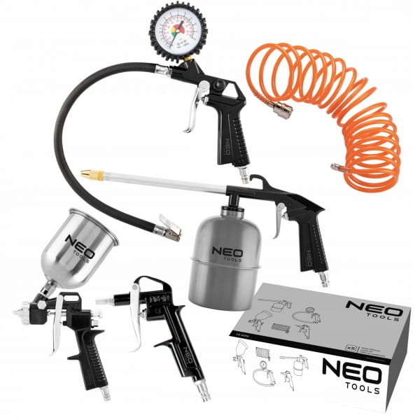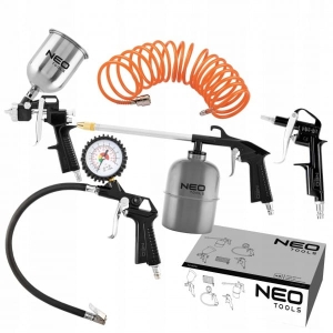 Zestaw lakierniczy, 14-699, NEO składa się z 5 elementów. W jego skład wchodzi: pistolet lakierniczy z górnym zbiornikiem, pistolet do ropowania, pistolet do przedmuchiwania, pistolet do pompowania kół z manometrem oraz wąż ciśnieniowy spiralny o długości 5m. Zestaw daje szeroki zakres zastosowań w warsztacie, jak na przykład lakierowanie, pompowanie lub oczyszczanie powierzchni. Certyfikat CE potwierdza wysoką jakość narzędzi. Marka NEO spełnia oczekiwania profesjonalistów.