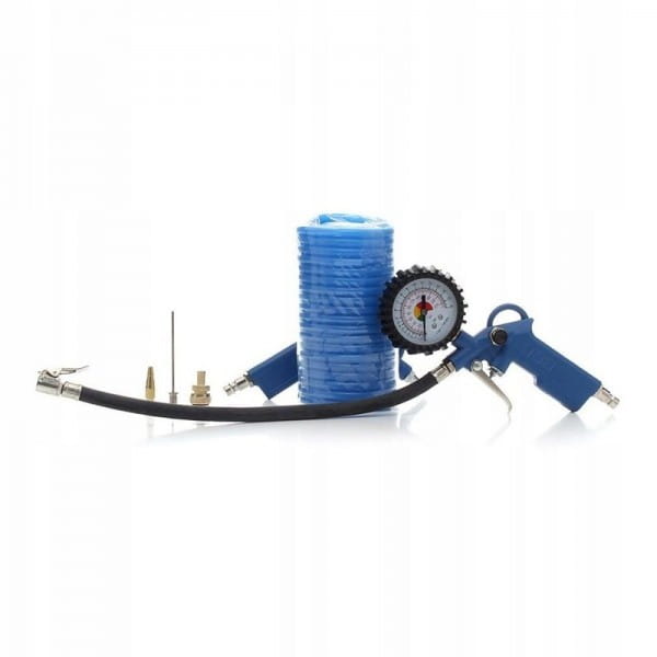 - Pistolet do przemywania tzw."ropownica" ma długą, praktyczną dyszę rozpylającą, która ułatwia mycie i czyszczenie Pistolet do pompowania z manometrem jest doskonały do pompowania i kontroli ciśnienia ogumienia pneumatycznego. Posiada gumową obudowę zegara. Wyposażony jest w zawór spustowy powietrza.