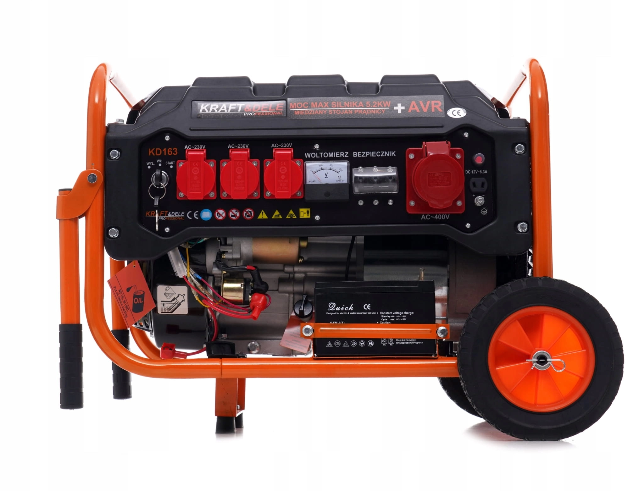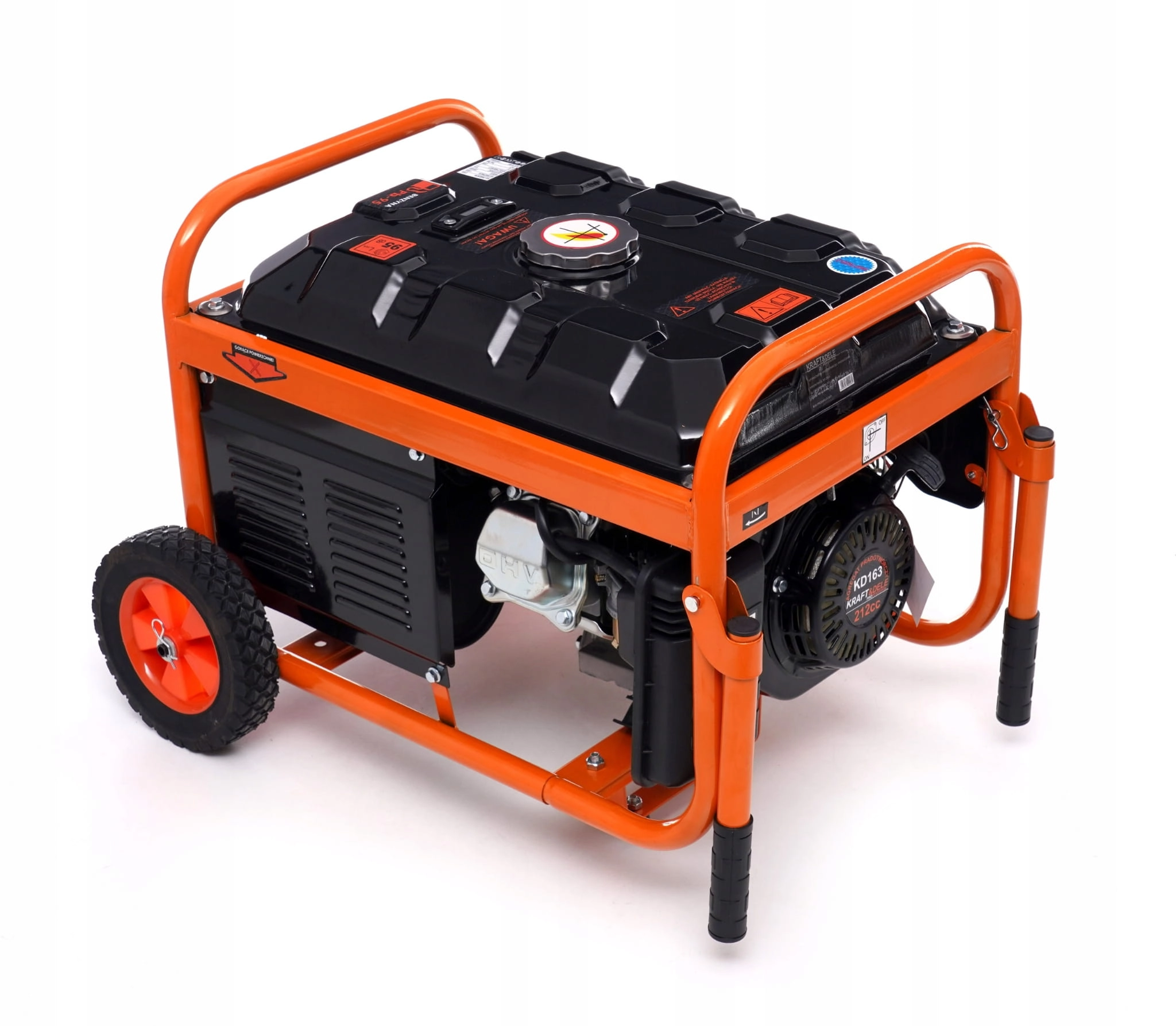 Przenośny agregat prądotwórczy trójfazowy o oznaczeniu KD163 marki Kraft&Dele przeznaczony jest do generowania prądu 220V-400V za pomocą silnika spalinowego japońskiej konstrukcji OHV 4-suwowego o mocy 7KM/5,2KW oraz mocy nominalnej prądnicy 2800W.