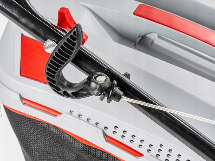 Pojemny kosz siatkowy o pojemności 60 litrów z pokrywą przeciwpyłową z tworzywa sztucznego zbiera skoszoną trawę. Wskaźnik zapełnienia kosza zapobiega przepełnieniu kosza i eliminuje konieczność częstego zatrzymywania się i sprawdzania kosza. Klapka, która zmienia położenie - gdy kosz jest pełny, klapka opada, sygnalizując konieczność opróżnienia. Kosz ma wygodną rączkę, dzięki której łatwo go zanieść w celu opróżnienia. Ergonomiczna rączka z miękkim wykończeniem ułatwia sterowanie kosiarką. Na kierownicy umieszczony został praktyczny schowek na drobne przedmioty oraz miejsce na napoje. Składana rękojeść umożliwia przechowywanie kosiarki w ograniczonych przestrzeniach. Regulacja prędkości obrotowej za pomocą dźwigni, pozwala dostosować prędkość kosiarki do wykonywanej pracy. Uchwyt do zawieszenia linki rozrusznika blisko górnego uchwytu, umożliwia rozruch kosiarki bez schylania się. | |