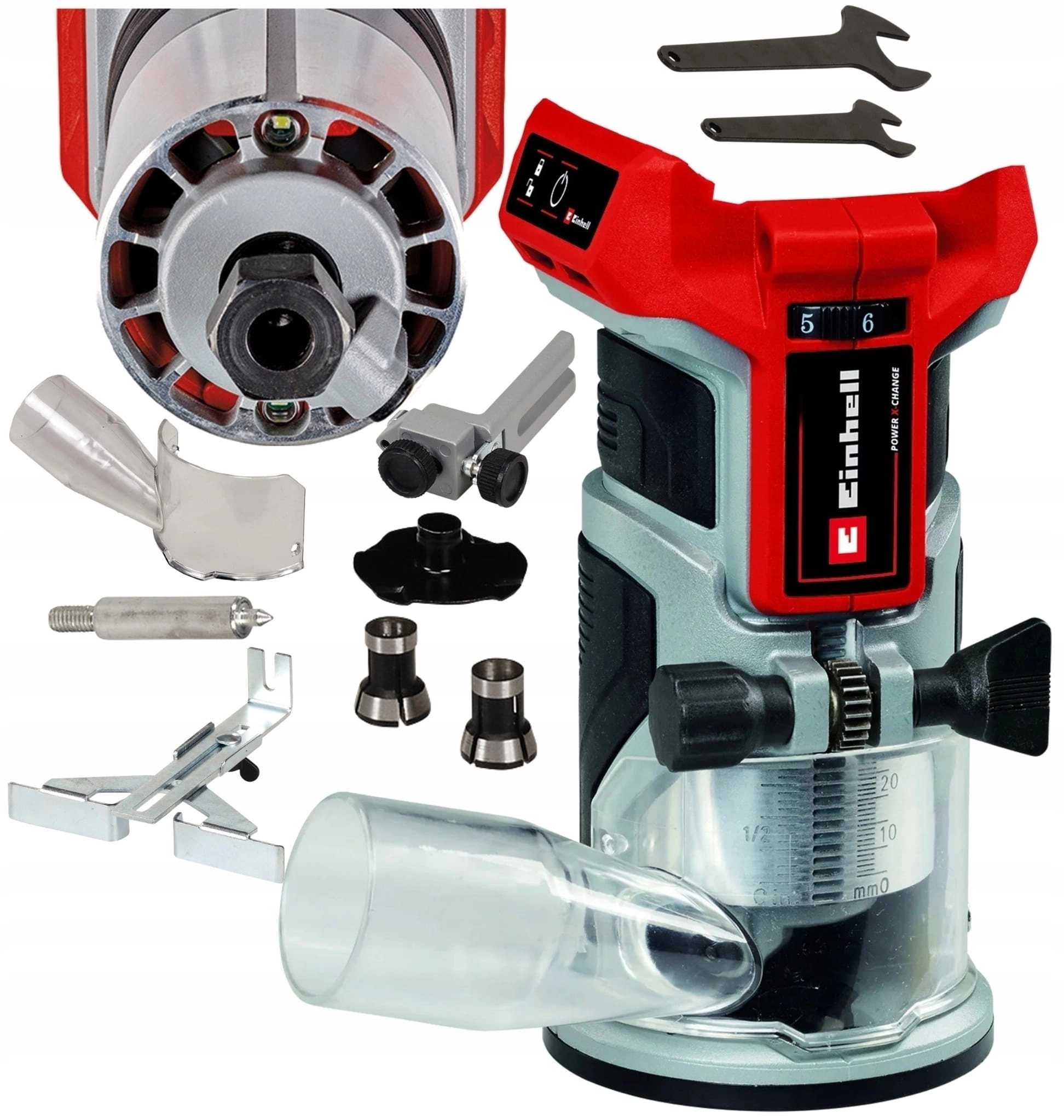 Zakres dostawy obejmuje ogranicznik równoległy, końcówkę kompasu, rolkę prowadzącą, tuleje kopiująca i klucze, a także adapter ssący, odpowiedni do odkurzaczy na mokro i na sucho Einhell.